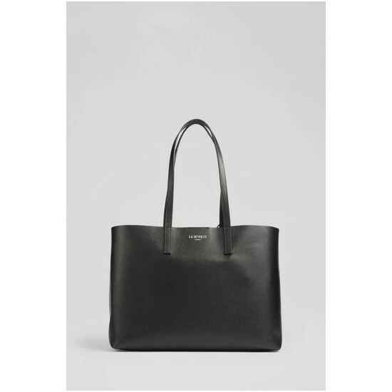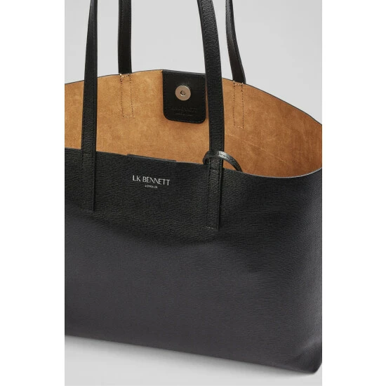 The Adele tote is crafted in Italy from recycled saffiano leather in black. It’s a large open tote with double handles, and a popper fastening and is unlined with a matching zip-across pouch on a removable strap inside.