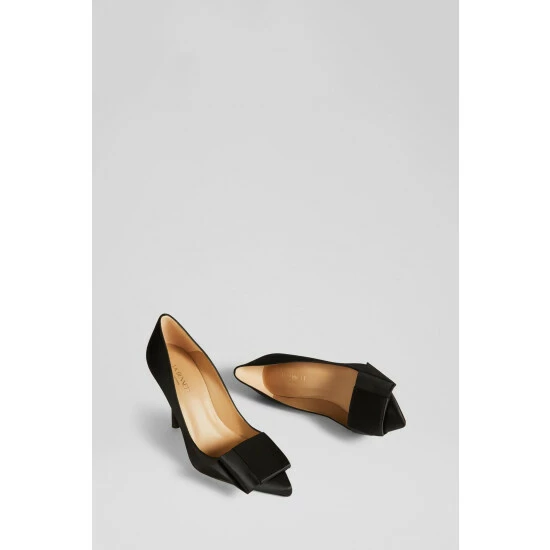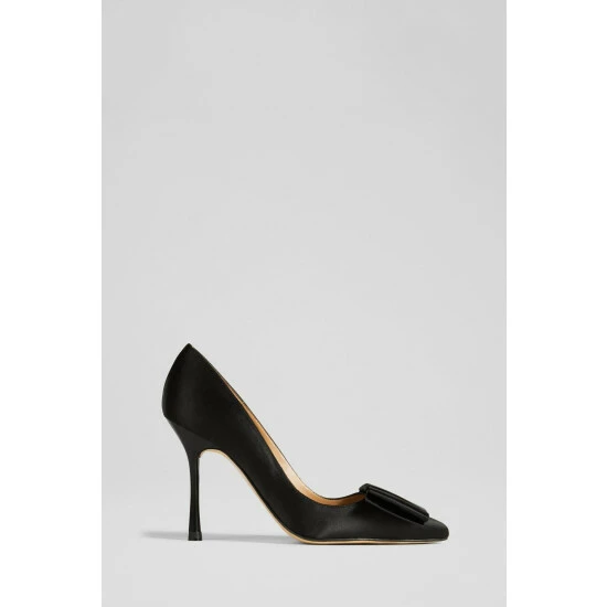 The Agathe court shoes are crafted in Spain from black satin. They have a pointed toe, half bow detail across the front of the foot, a sleek silhouette and a 100mm stiletto heel.