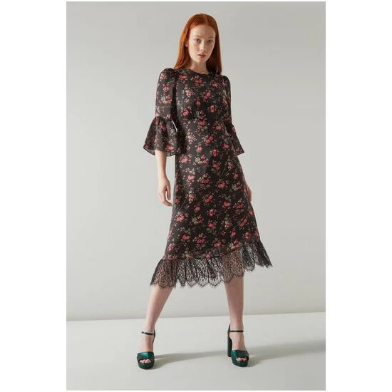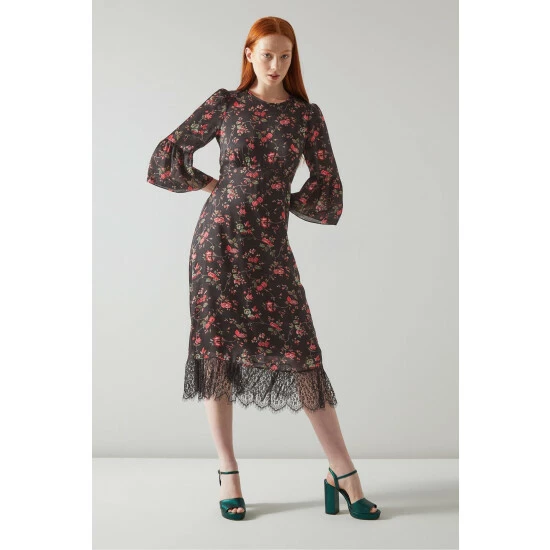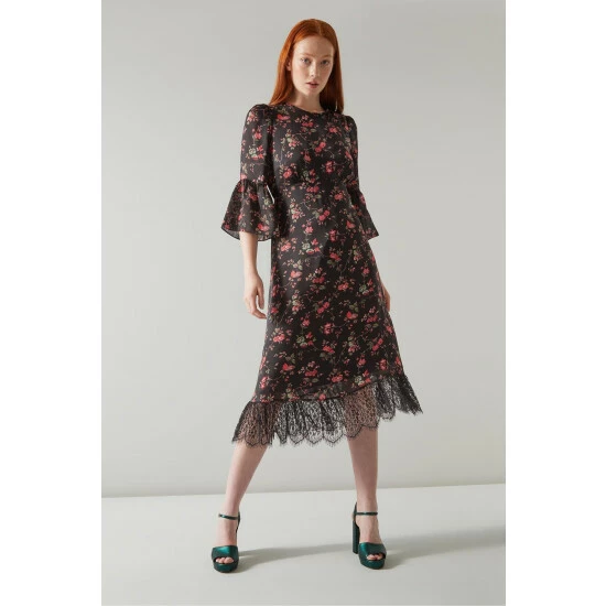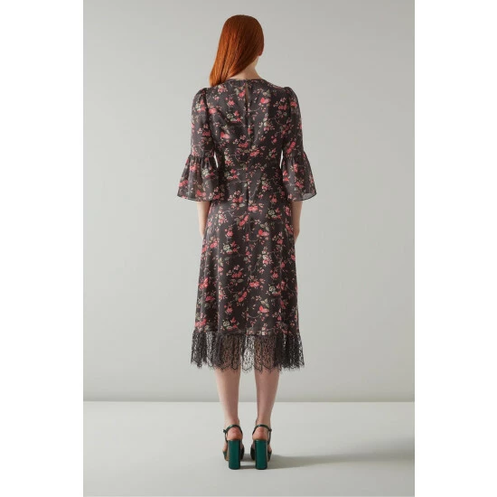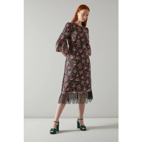 The Aggie dress is crafted from silk satin in black with a red and green 18th century vintage archive clematis print. It has a round neck, puff shoulders, and three-quarter sleeves with a fluted finish and it falls to a midi length trimmed in black lace.