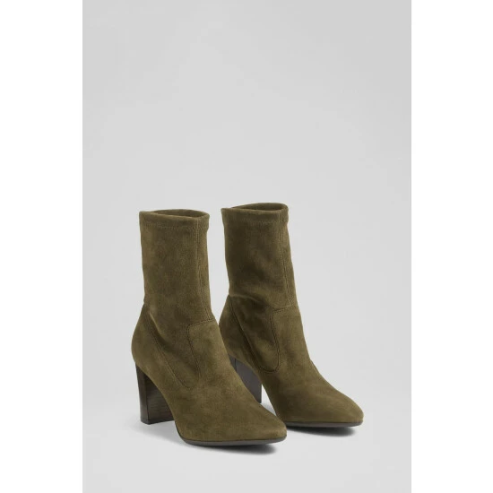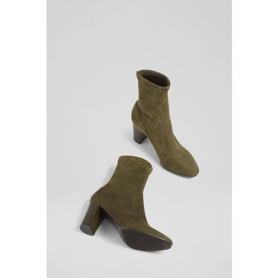 The Alice ankle boots are crafted in Italy from olive green stretch suede. They have almond-shaped toes, a pull-on sock-like shape and stacked, 75mm block heels.