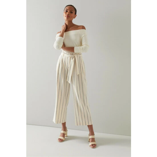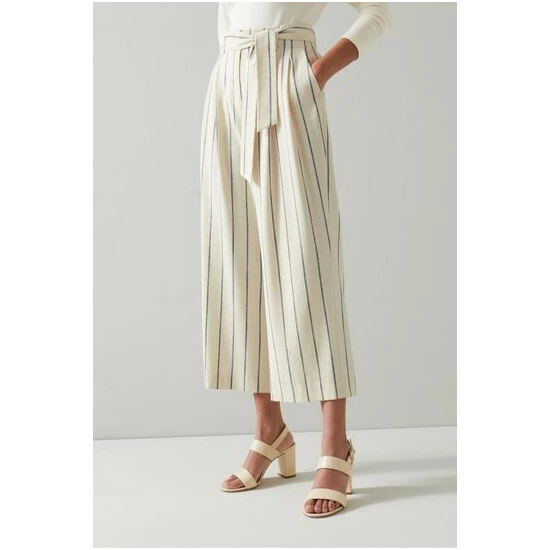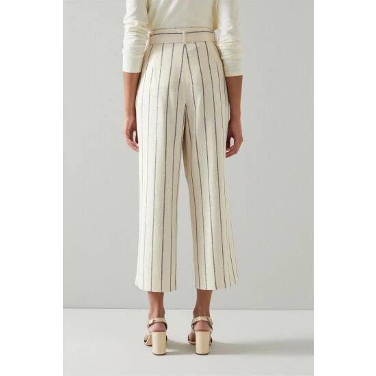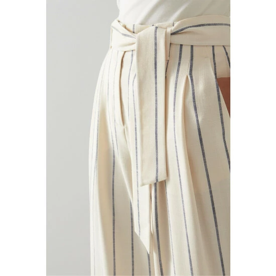 The Almeida trousers are crafted from a lightweight fabric in cream with blue wide pinstripes. They sit on the waist with belt loops and a tie belt, they have side pockets, pleat detail to the front and fall to a wide cut and a cropped length.