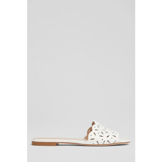 The Amaya mules are crafted in Spain from smooth calf leather in white. They have a single wide strap over the foot embellished with a perforated pattern and a flat heel.