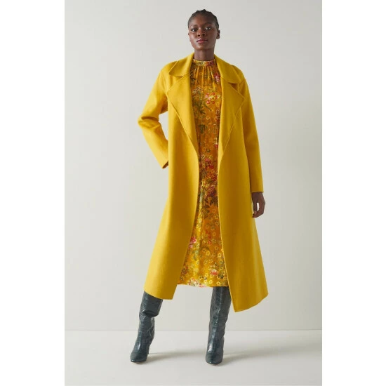 The Anderson coat is crafted from luxurious and super-soft double-faced wool in golden yellow. It s an unstructured style with a large lapel, a tie belt, large patch pockets and it falls to the mid-calf.