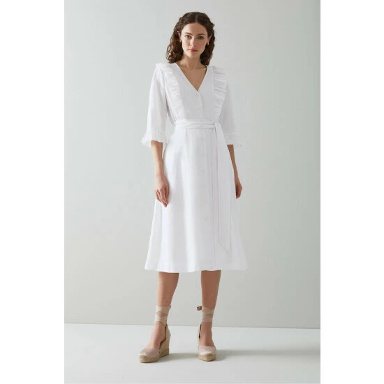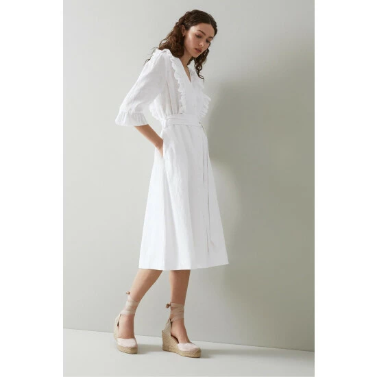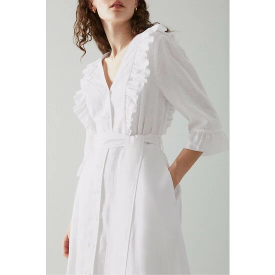 The Anya shirt dress is crafted from white linen. It has a V-neck, frill detail across the front, over the shoulders and down the back, it has three-quarter sleeves, a tie belt, side pockets and falls to just below the knee.