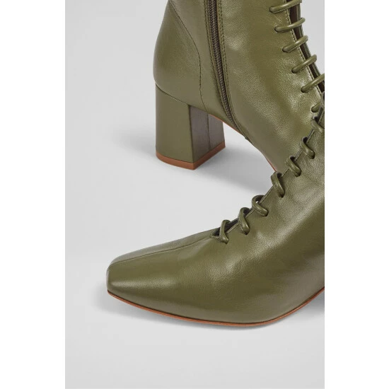 The Arabella boots are crafted in Spain from olive green nappa leather. They have a square toe, lace up to the front, have an inside zip and a 60mm block heel.