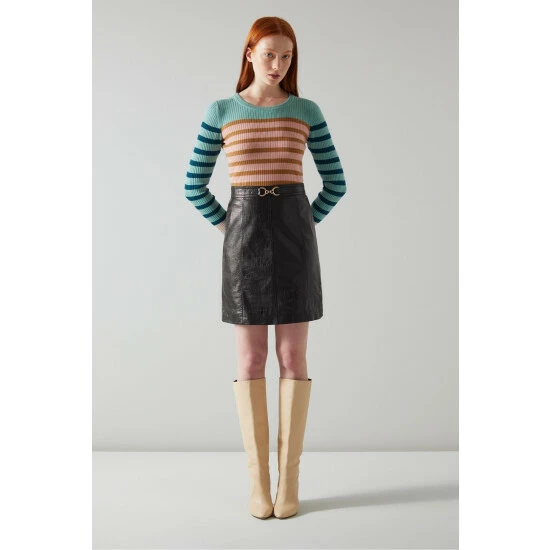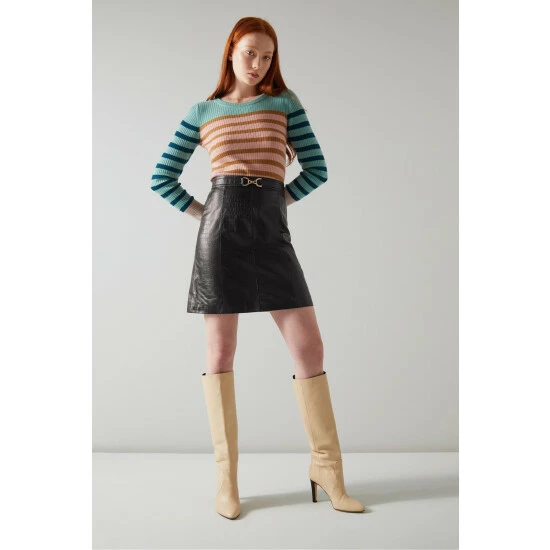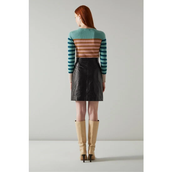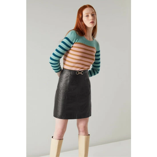LK Bennett Aubree Black Croc-Embossed Leather A-Line Skirt