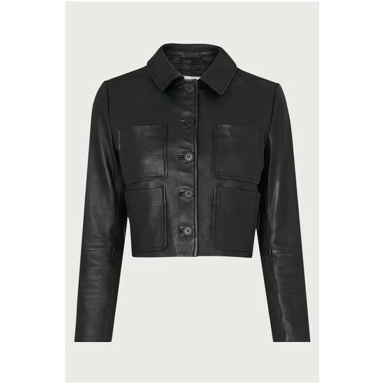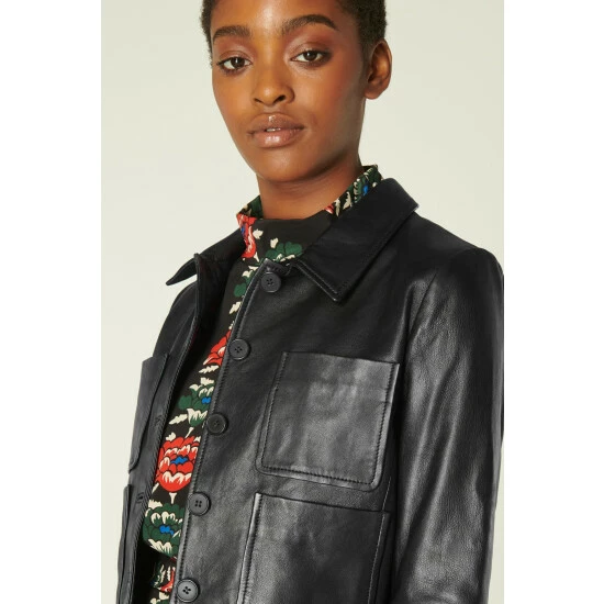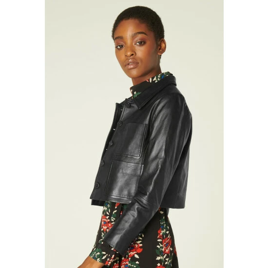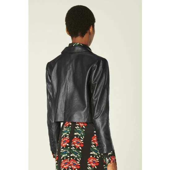 A feminine take on the classic leather jacket, this chic cropped style is a brand new style this autumn/winter. Crafted from beautifully-soft Italian black leather, it has a neat collar, four-pocket detail, buttons through with black buttons and has a neat cropped length that sits perfectly at the waistline.