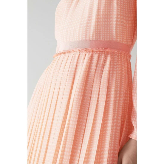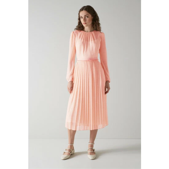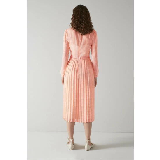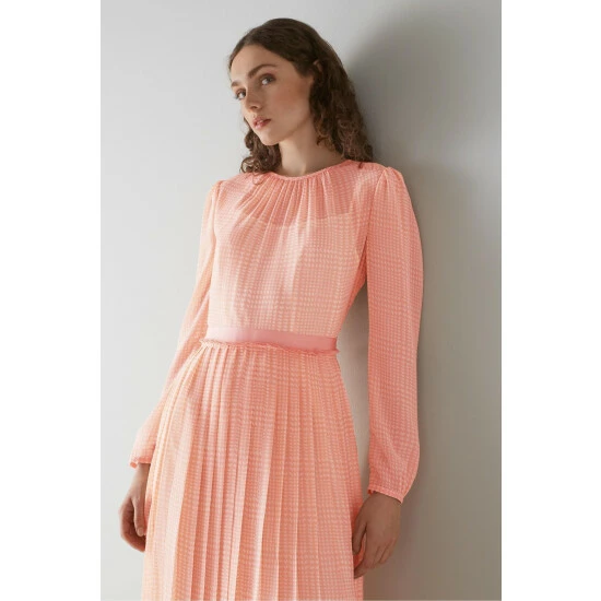 The Avery midi dress is crafted from a lightweight georgette in a pink and cream houndstooth print from vintage archives. It has a round neck with pleating detail, puff shoulders, sheer long sleeves, a pleated waistband and it falls to a midi length in pleats.