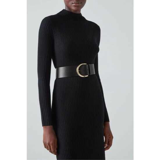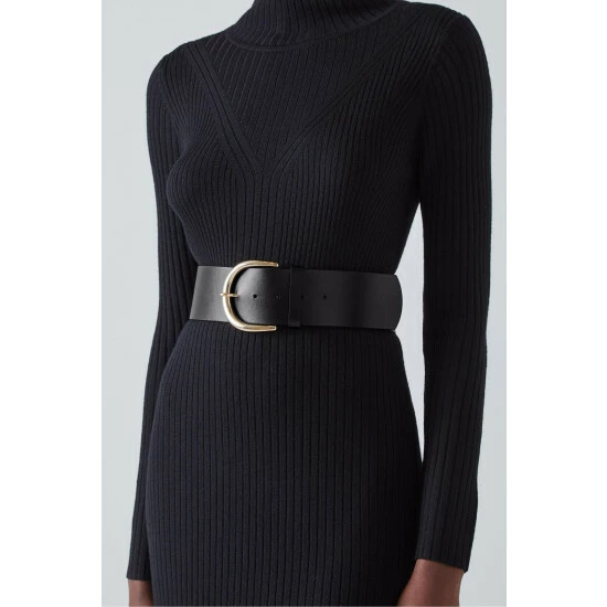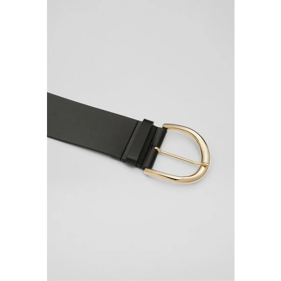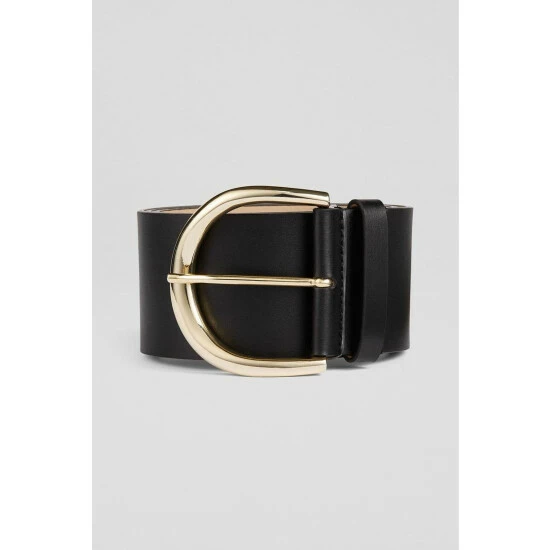 The Bea belt is crafted in Italy from black leather. It’s a wide style with a half-oval gold buckle.