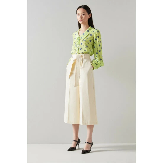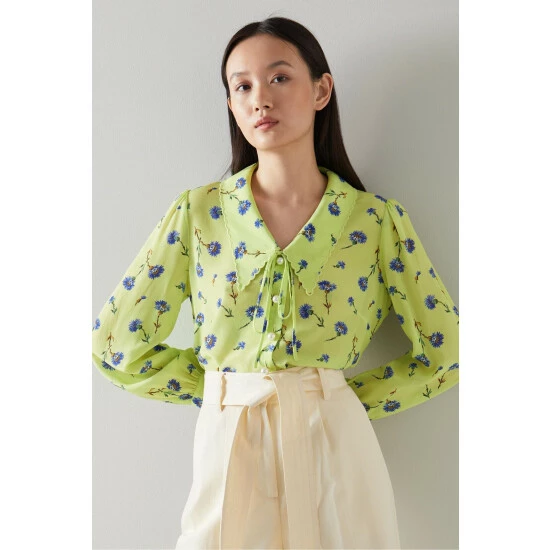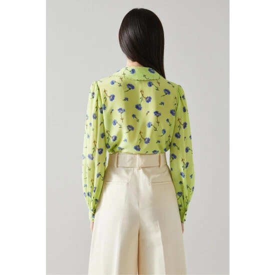 The Beecham blouse is crafted from lime sherbet silk satin with a vintage archive hand painted blue cornflower print. It has a V-neck with a pointed scallop edge collar and bow, puff shoulders, long cuffed sleeves, pearl buttons and a regular fit.
