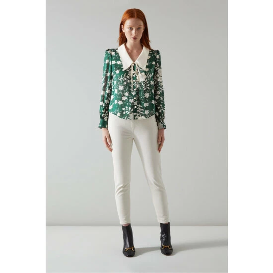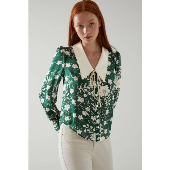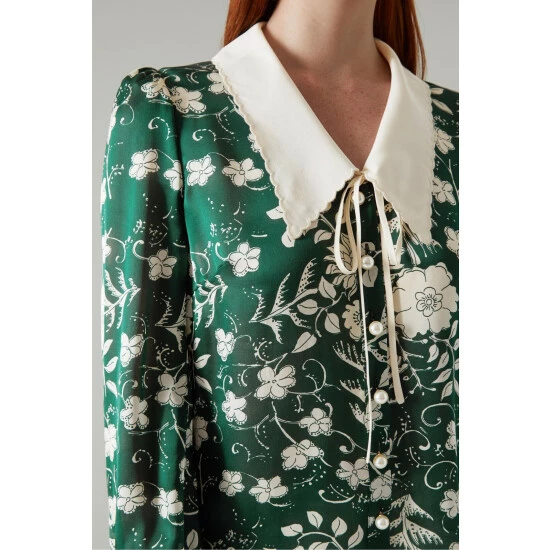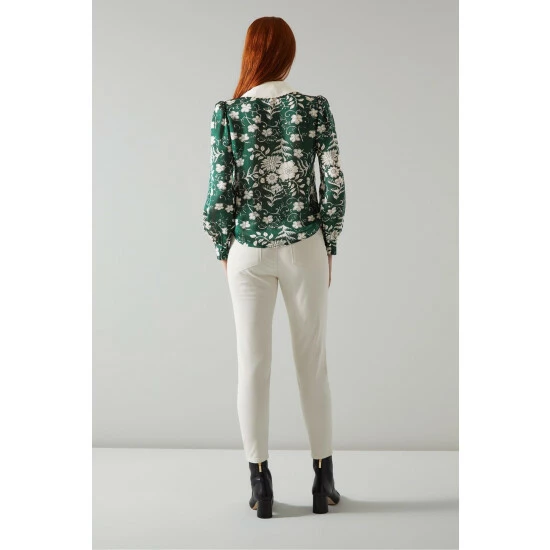The Beecham blouse is crafted from a pine grove green silk with a vintage archive whimsical floral print in cream. It has a V-neck with a pointed scallop edge cream collar and bow, puff shoulders, long cuffed sleeves, pearl buttons and a regular fit.