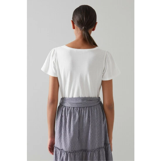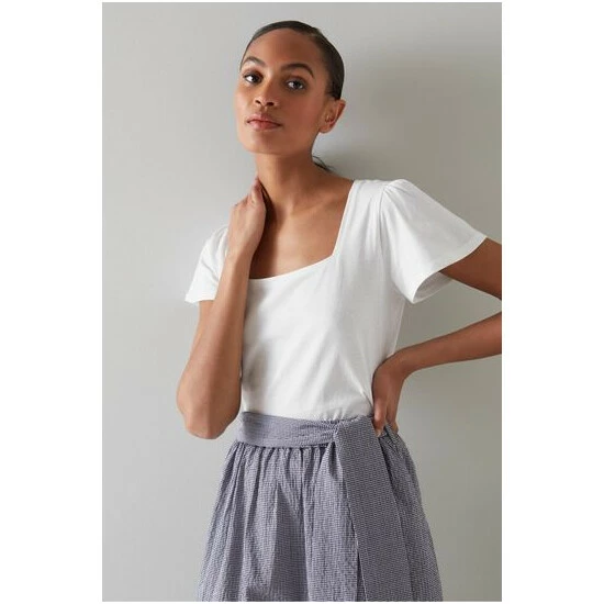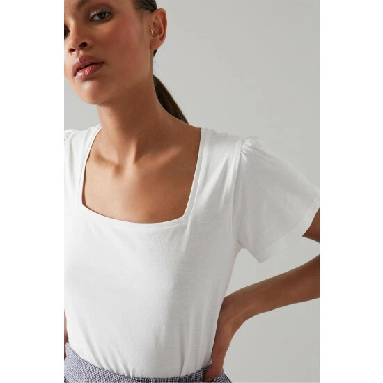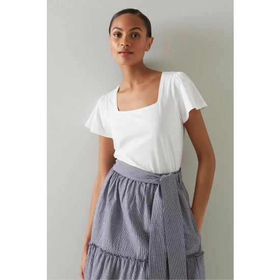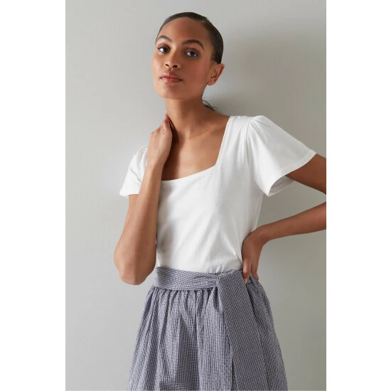 The Betty T-shirt is crafted in Portugal from white cotton. It has a square neck, subtle pleating at the shoulders, short fluted sleeves and a regular fit.