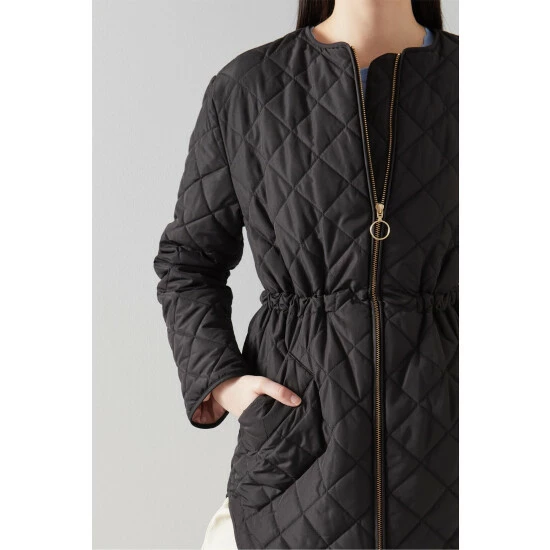 The Garance quilted jacket is crafted from black fabric with a soft, silky feel. It’s a collarless, zip-through, hip-length style with an internal drawstring waist and slanted welt pockets.