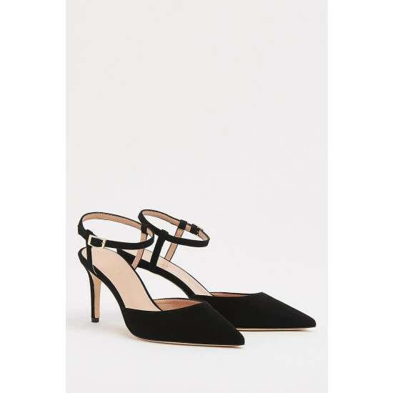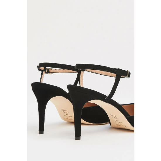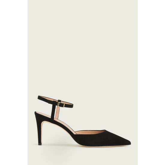 The Hope strappy courts are crafted in Italy from black suede. They have a pointed toe, a delicate ankle strap and an 80mm stiletto heel.