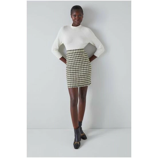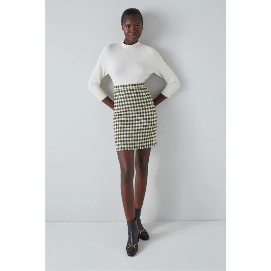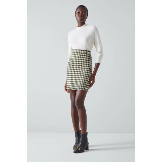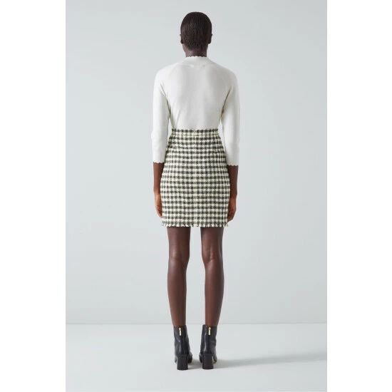 The Keeler skirt is crafted in Europe from Italian black and cream gingham tweed, it sits on the waist, has a straight cut, falls above the knee and is finished with a frayed edge.