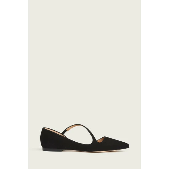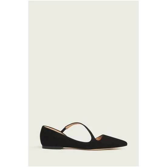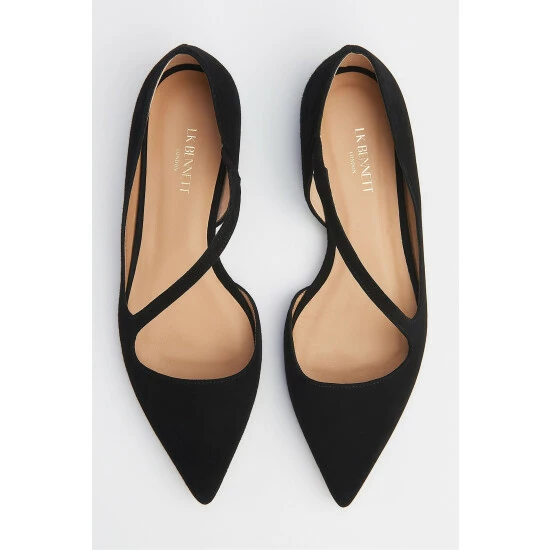 A contemporary take on a simple pair of flats, this Pandora pumps are a chic addition to any shoe collection. Crafted in Spain from super-soft black suede, they have a pointed toe, an elasticated asymmetric strap across the foot and a small heel. Wear them with cropped trousers, skirts or dresses to show off their stylish shape.