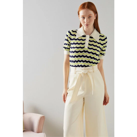The Amanda knitted top is crafted from a cream, navy and green cotton-blend knit. It has a laddered scallop stitch, a wide contrast collar in cream, puff shoulders, a half placket of pearl buttons, short sleeves with a contrast cuff and a regular fit.