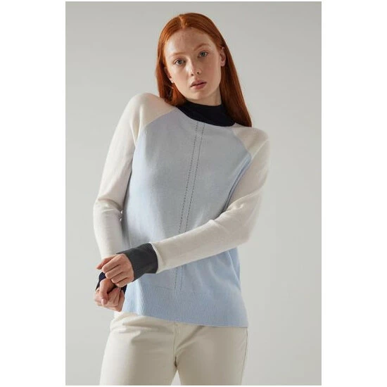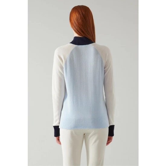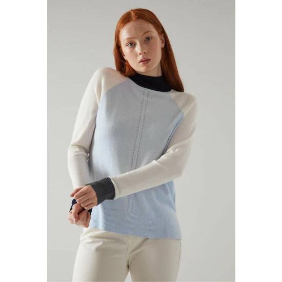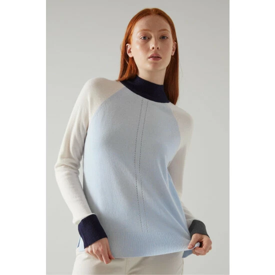 The Bergen jumper is crafted from a Merino-wool blend with a touch of cashmere in colourblocked pale blue, cream and navy. It has a funnel neck, raglan sleeves, ladder stitch detail to the front and a slit side hem.