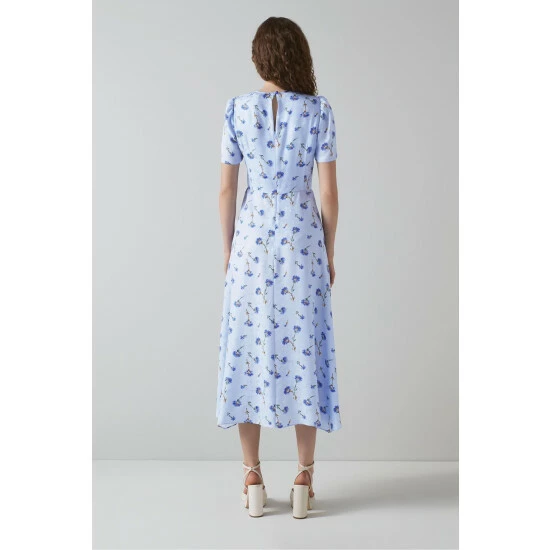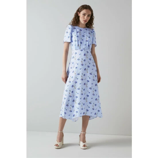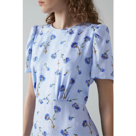 The Boyd midi dress is crafted from blue silk floral jacquard with a vintage archive hand painted cornflower print. It has a round neck, short puff sleeves, pleating to the bodice and a floaty, dipped hem midi skirt.