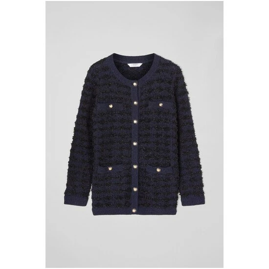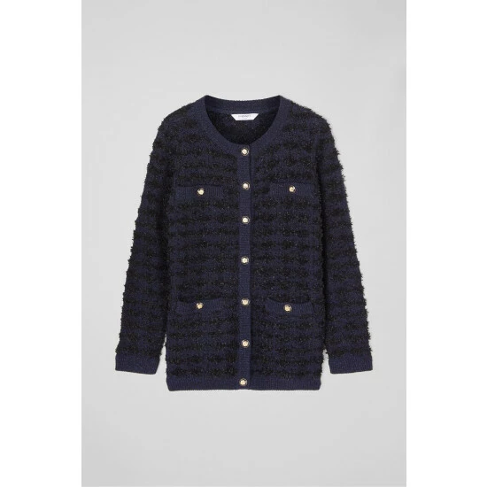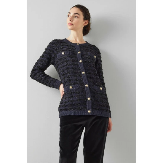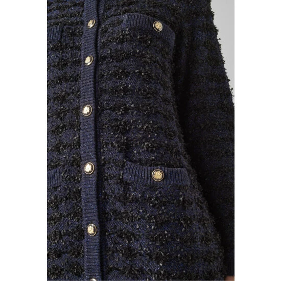 The Clyde long cardigan is crafted from a navy blue and black check cotton-metallic fibre blend. It has a round neck, navy trim, gold crest buttons and double patch pocket detail.