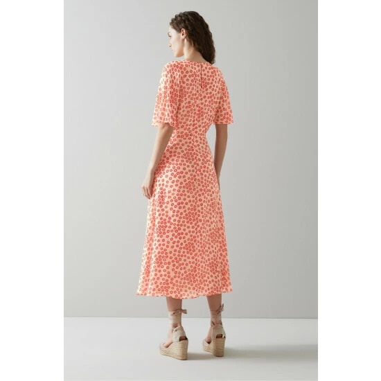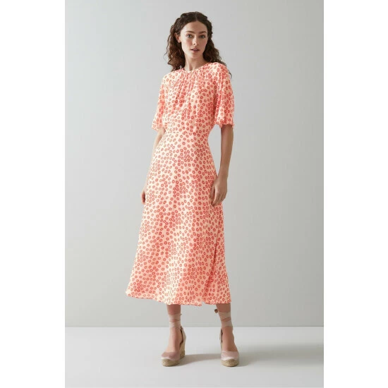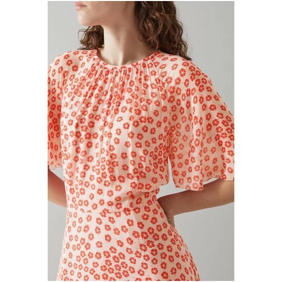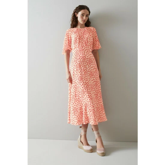 The Elowen dress is crafted from a lightweight, silky fabric in a vintage archive 1960’s blossom print in pink. It has a round neck with pleat detail to the front, short cape sleeves and a floaty, midi skirt.