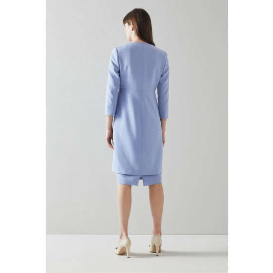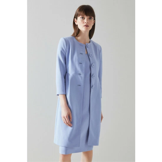 The Georgia frock coat is crafted from lavender crêpe. This collarless style has a sixties look with single-breasted, large covered buttons, subtle pleating at the nipped waist, bracelet sleeves and just-below-the-knee length.