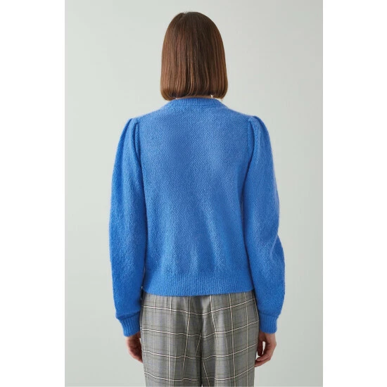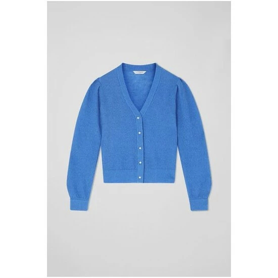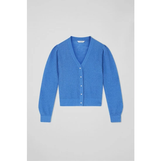 The Ginny cardigan is crafted from a luxurious mohair-wool blend in blue. It’s a V-neck style with a stylish moss stitch, pretty pearl buttons, long sleeves and a classic fit.