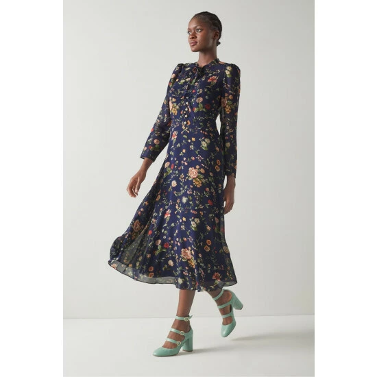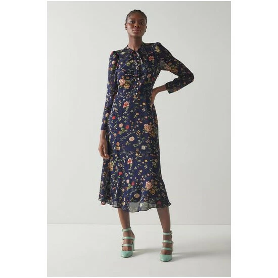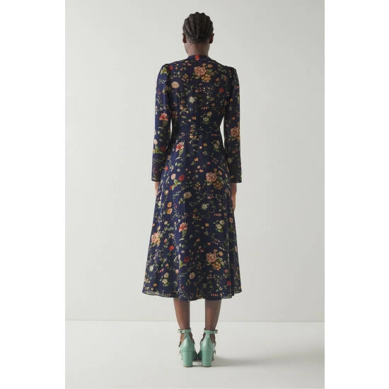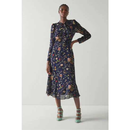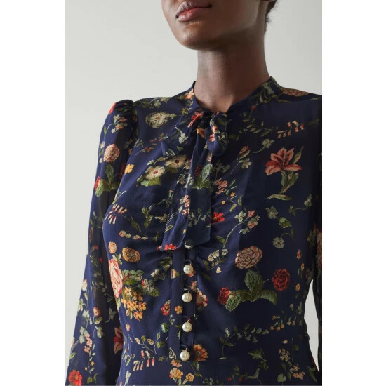 The Keira midi dress is crafted from navy blue silk sheer georgette with a vintage archive chintzy camelia print. It has a round neck with tie detail, puff shoulders, long sleeves, fully-functioning pearl buttons, a figure-skimming fit and a midi-length flippy skirt.