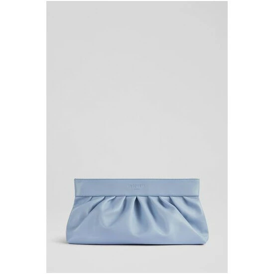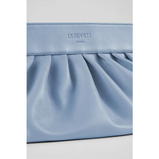 The Abbie clutch is crafted in Spain from iris blue nappa leather. It is a pleated, pouch style with a snap-shut top and it has an inside slip pocket.
