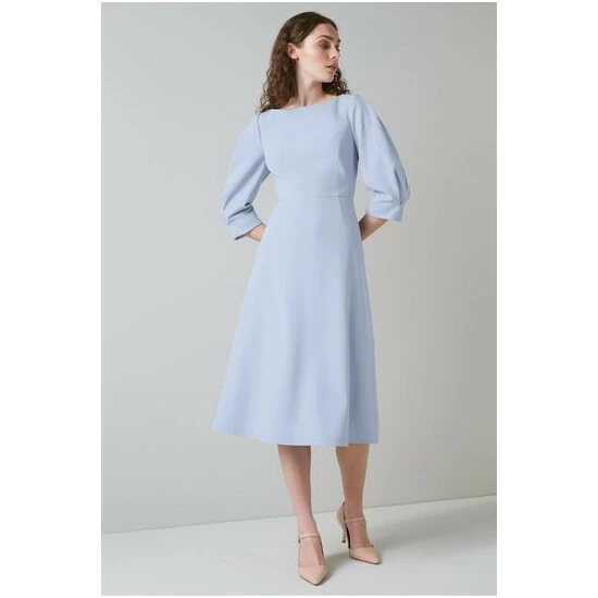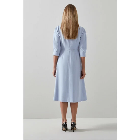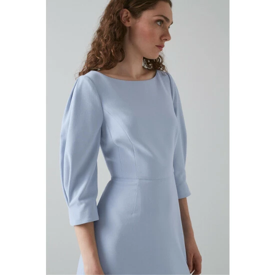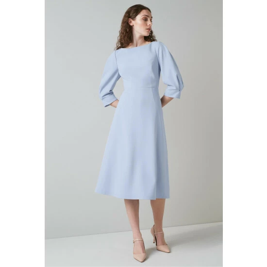 The Lemoni dress is crafted from a bright light blue crepe. It has a round neck, pleated three-quarter length sleeves, a nipped waist and a full skirt which falls to just below the knee.