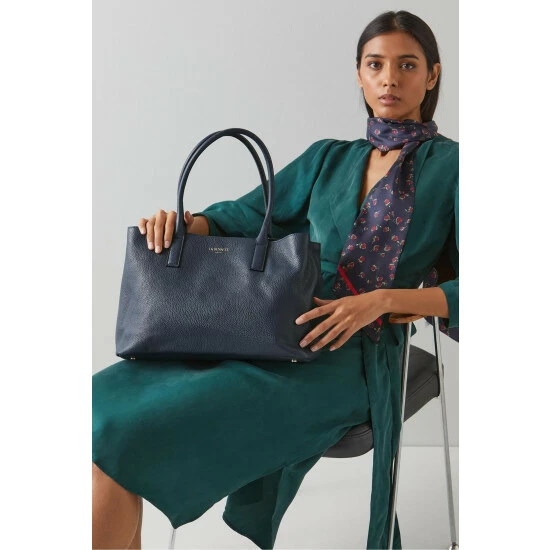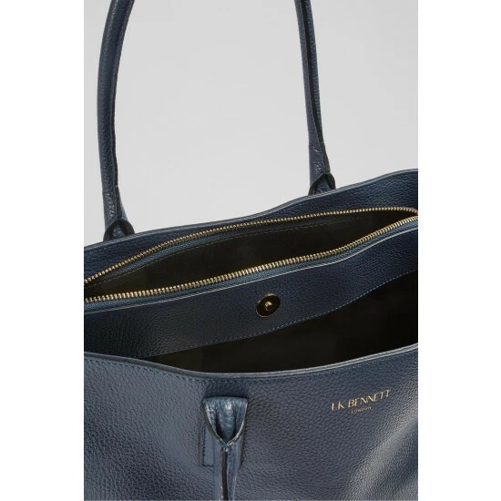 The Lillian tote bag is crafted in Italy from grainy leather in navy blue. It has three compartments – one of which zips up – that fit A4 papers and files, and has two large top handles.