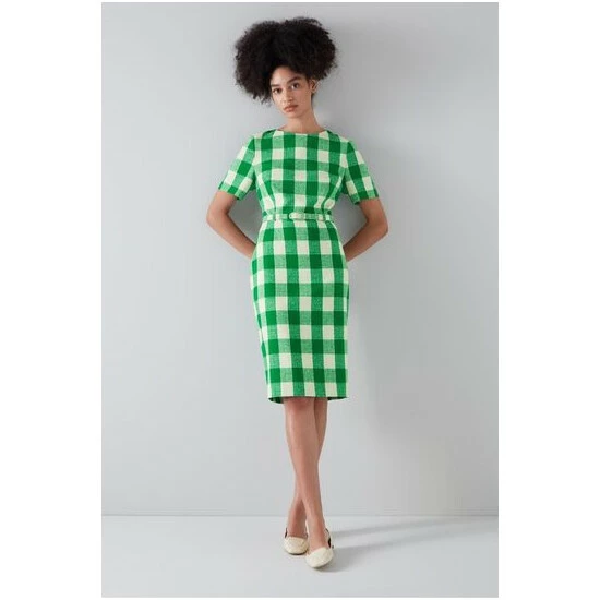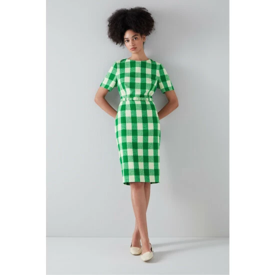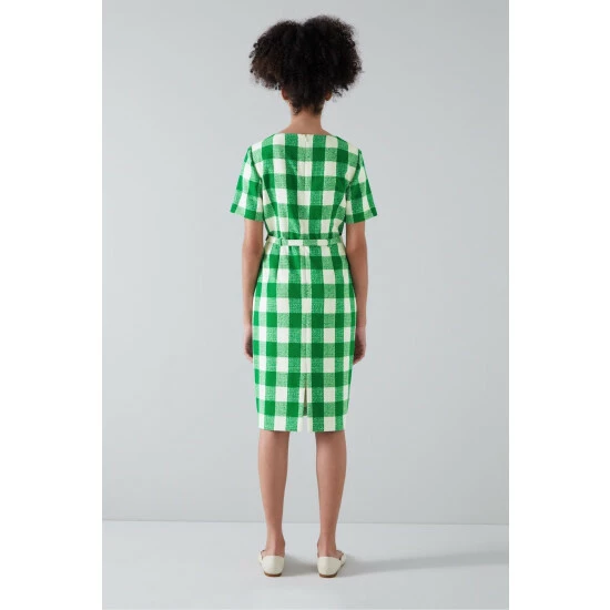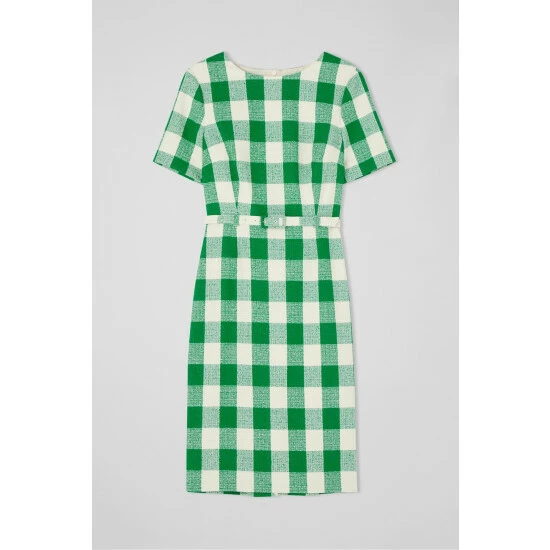 The Maren dress is crafted from textured Portuguese fabric in a large green and cream gingham check. It has a round neck, short sleeves, a skinny buckle belt and a pencil skirt with a back slit.