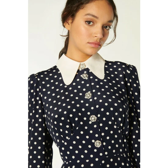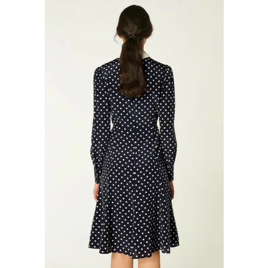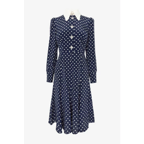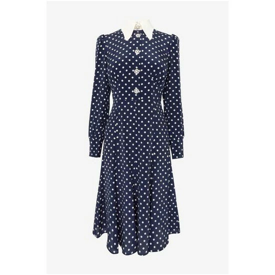 Mathilde, this tea dress drawing inspiration from the 1930s with a fun Seventies’ twist, is back for spring. Crafted from beautiful navy blue and cream silk with a classic polka dot print, it has a long, rounded cream collar, long sleeves, a half placket of sparkling crystal buttons, pleat detail to the bust, a nipped waist and a floaty knee-length skirt. Wear it with trainers, pumps or heels all season long.