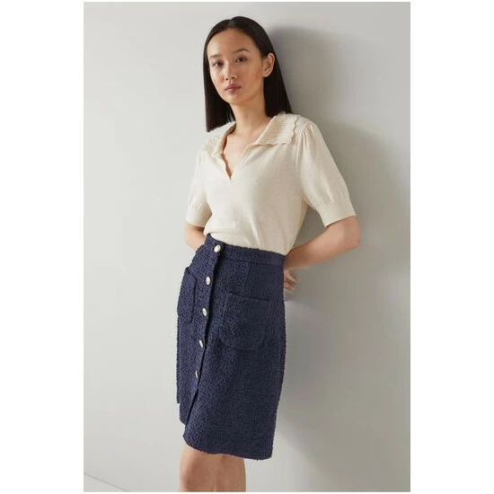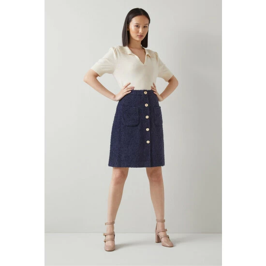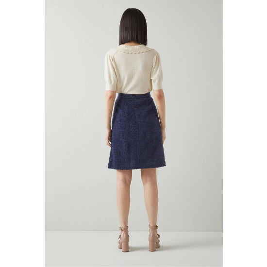 The Morten skirt is crafted in Europe from Italian navy blue tweed. It sits on the waist, has an A-line shape, patch pockets to the front, hammered matte gold buttons and it falls to above the knee.