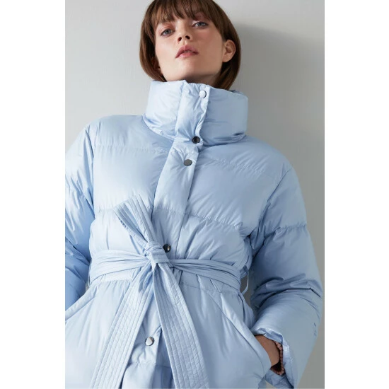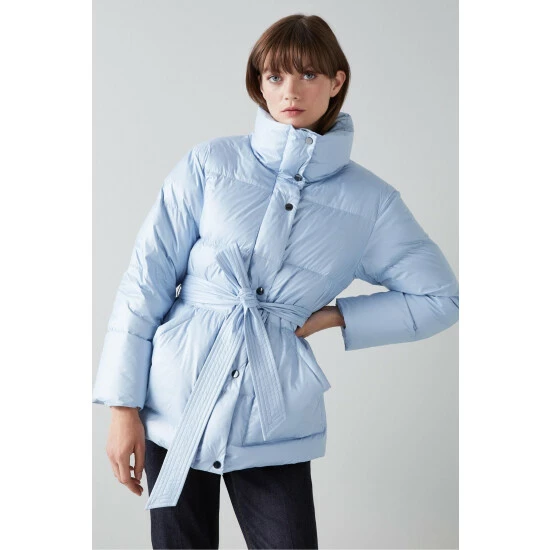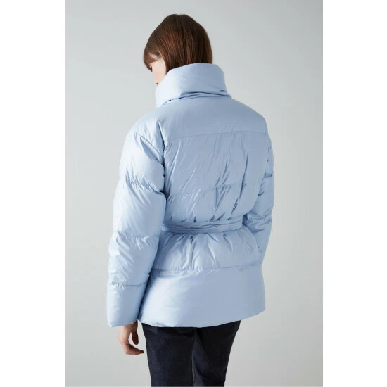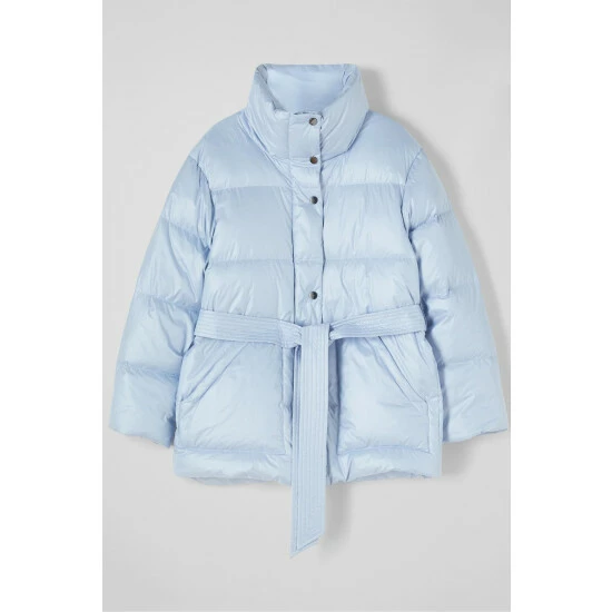 The Morzine puffer jacket is crafted from silky sky blue fabric and filled with recycled down. It’s a short style with a funnel neck, zip and button fastenings, side pockets and a tie belt.