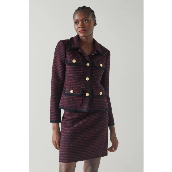 The Paloma jacket is crafted in Europe from Italian navy blue and red striped tweed. It’s got a boxy shape, a neat collar, double patch pockets and bronze anchor buttons.