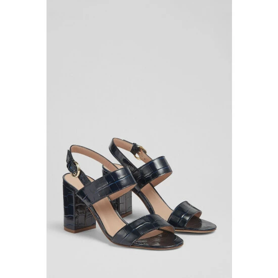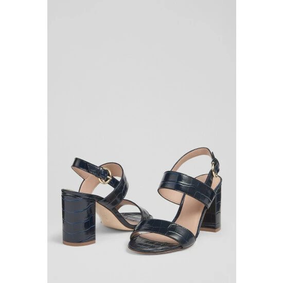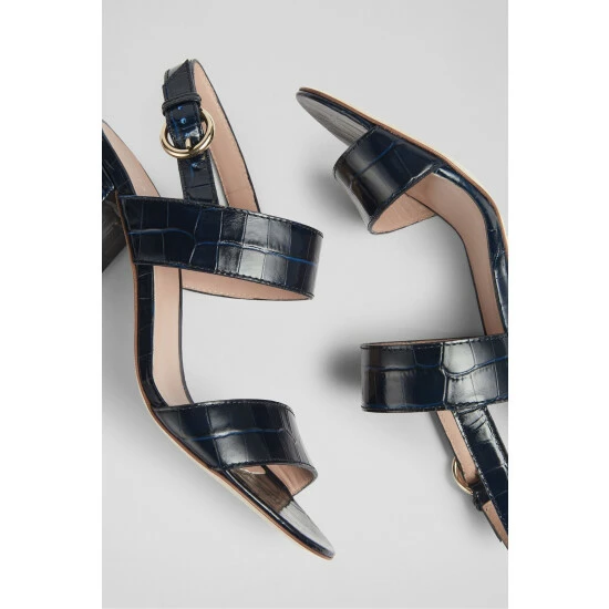 The Raya sandals are crafted in Italy from navy blue croc-effect leather. They have a wide strap over the toes, one over the foot, a back strap with a round buckle and an 80mm block heel.