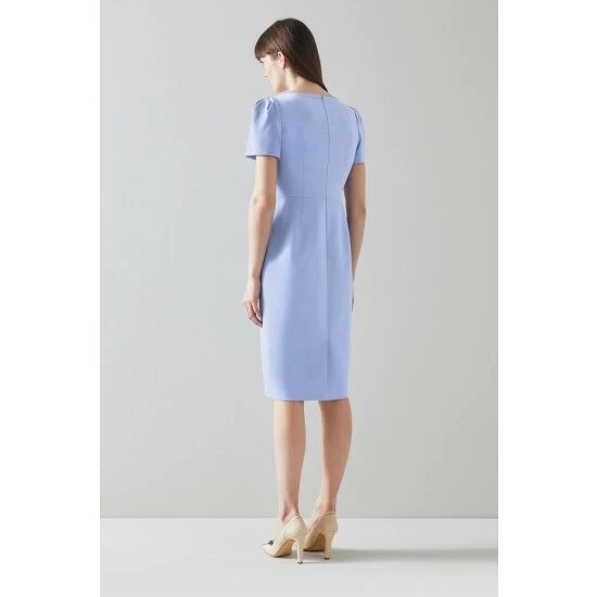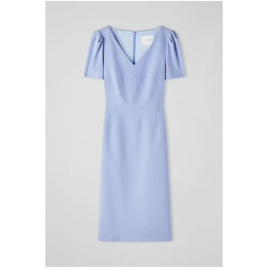 The Rebecca shift dress is crafted from stretch crêpe in lavender. It has a V-neck, puff shoulders, short sleeves, a fitted bodice and a pencil-style skirt with a back slit.