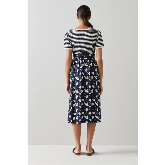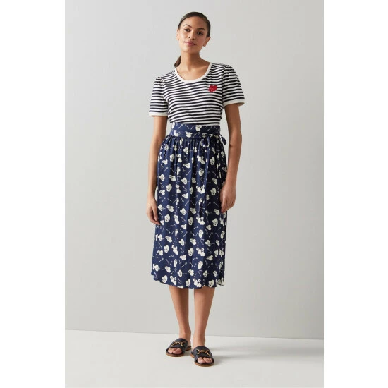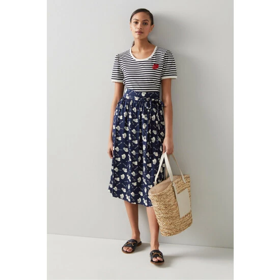 The Valerie skirt is crafted from silky fabric in a navy and cream 1960’s lock and heart print. It sits on the waist, has a tie belt, side pockets, soft pleats and falls to just below the knee.