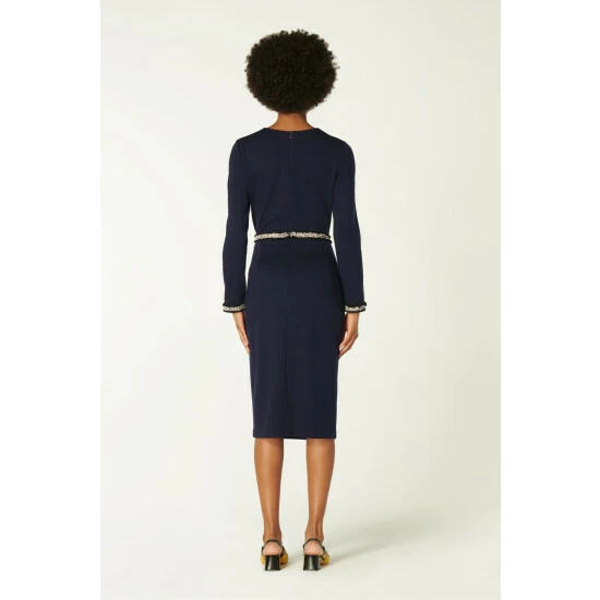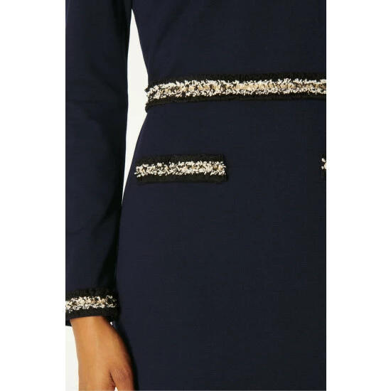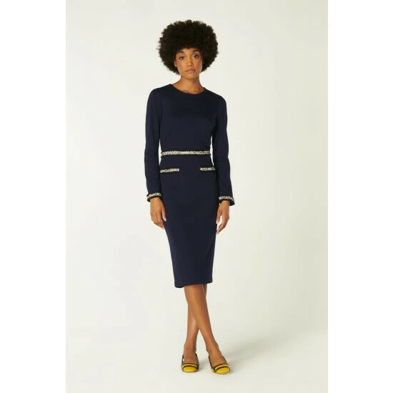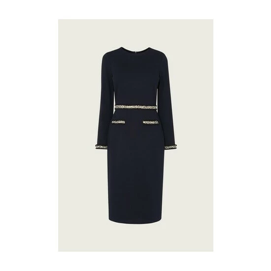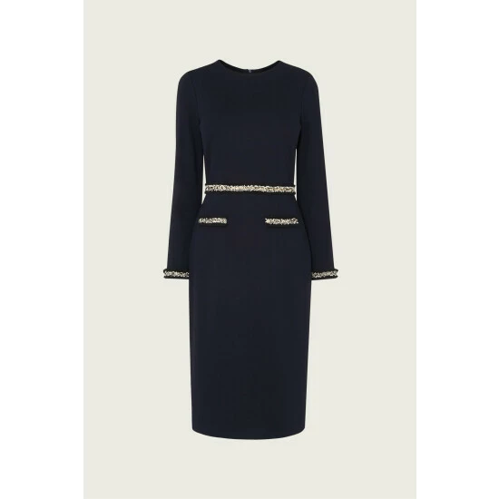A casual but chic twist on the classic shift dress, our new Vinnie dress takes on jersey and signature L.K.Bennett tweed. Crafted in Portugal from a super-soft jersey in navy blue, this stylish knee-length shift has a round neck, long sleeves, a slim fit, faux pockets and is trimmed with black and cream tweed. Wear it with colourful square-toe slingbacks for a fresh, spring feel.