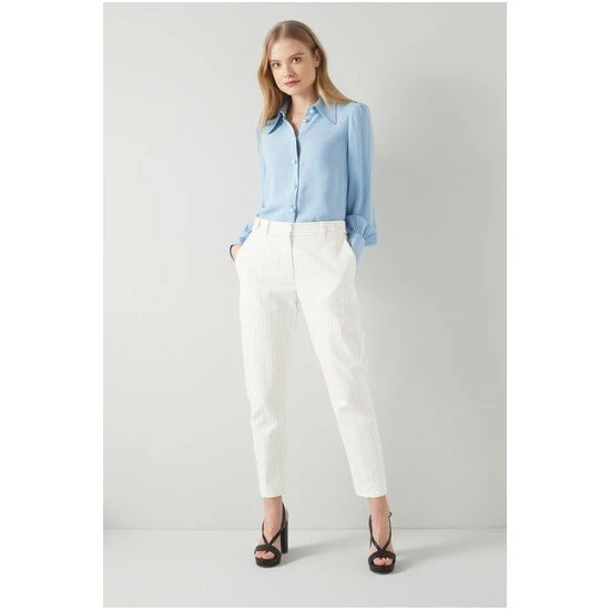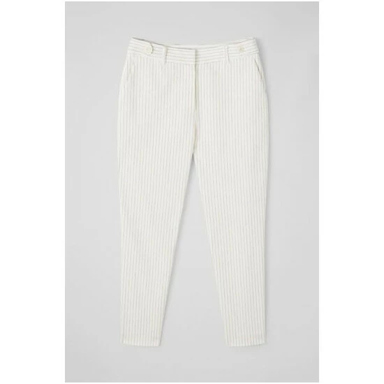 The Bree tailored trousers are crafted in Portugal from white pinstripe stretch cotton. They sit on the waist with belt loops and button-tab detail, have side pockets, a straight cut with pressed centre creases and are cropped at the ankle.