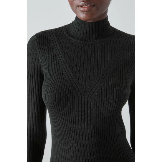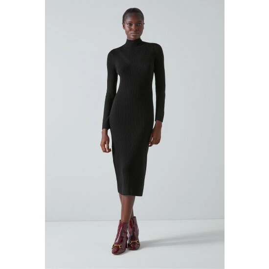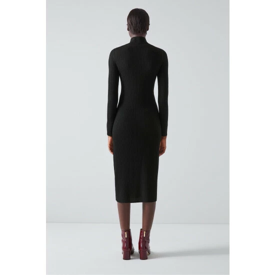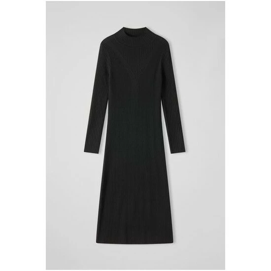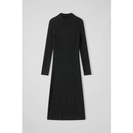 The Brigitte rib knit dress is crafted from lightweight merino wool in black. It has a turtle neck, long sleeves and a fitted shape falling to a midi length.