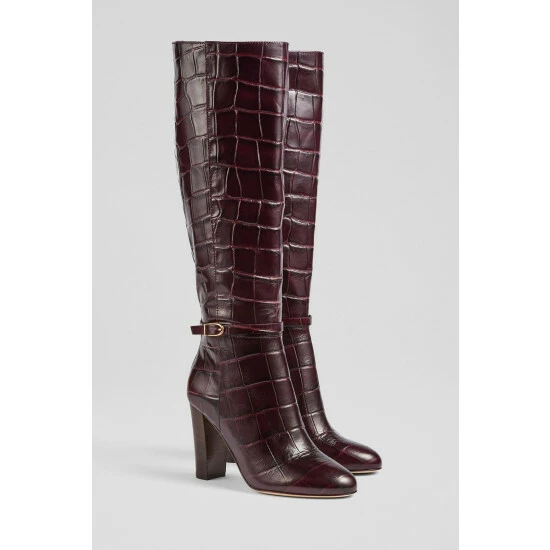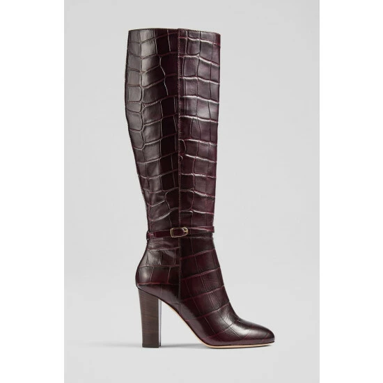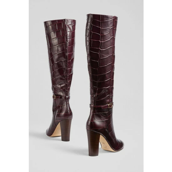 The Morgan knee-high boots are crafted in Italy from chocolate brown croc-effect leather. They have an almond-shaped toe, a half inside zip, a 90mm stacked block heel and gold buckle detail at the ankle.