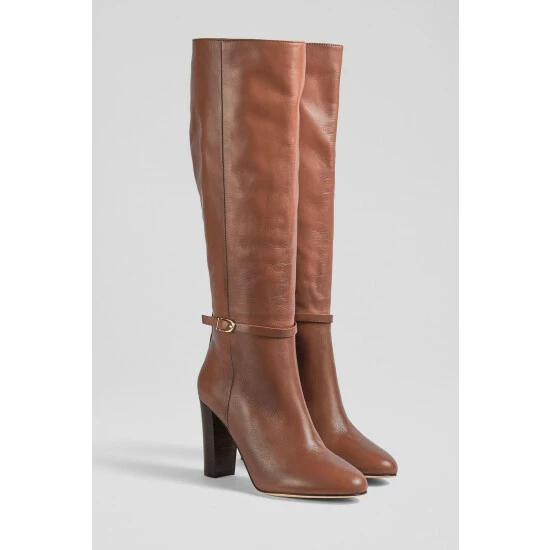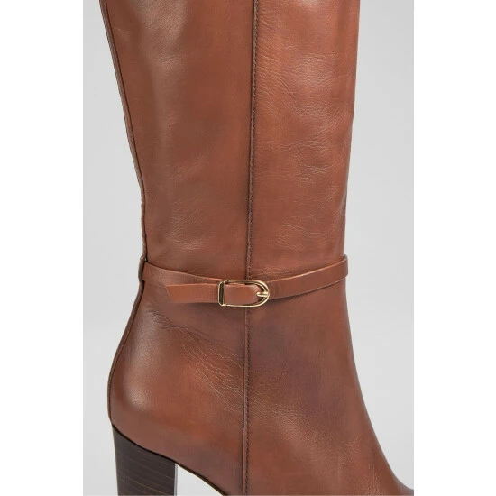 The Morgan knee-high boots are crafted in Italy from tan calf leather. They have an almond-shaped toe, a half inside zip, a 90mm stacked block heel and gold buckle detail at the ankle.