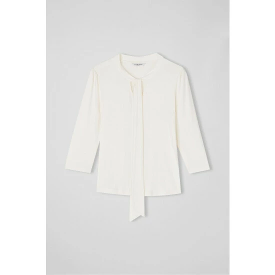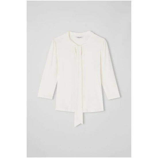 The Camilla top is crafted in Portugal from cream LENZING™ ECOVERO™. It has round neck with a pussy bow and cut-out detail, three-quarter length sleeves, a regular fit and a curved hemline.