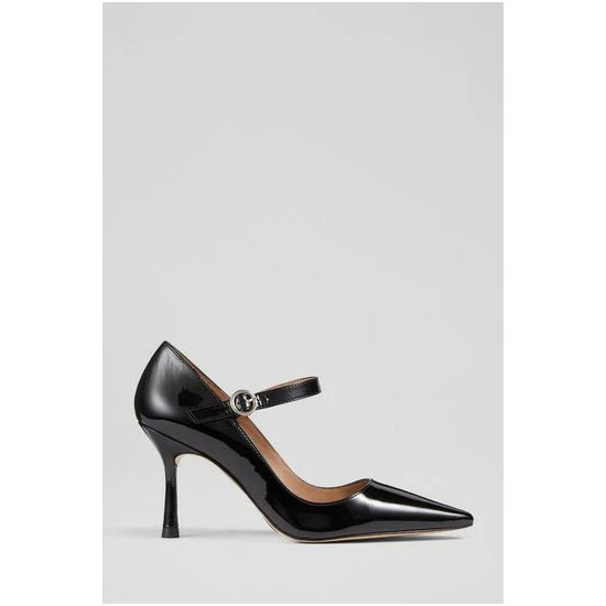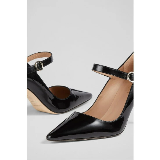 The Camille courts are crafted in Spain from black patent leather. They have a pointed toe, Mary-Jane styling with a round buckle and an 85mm stiletto heel.