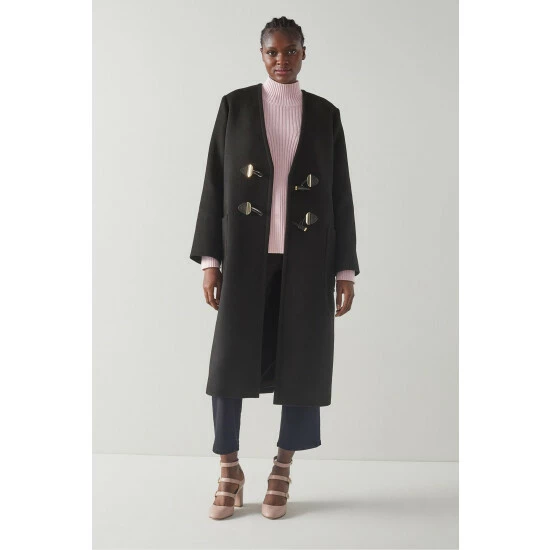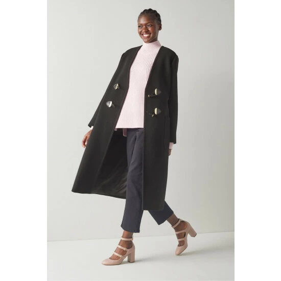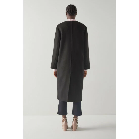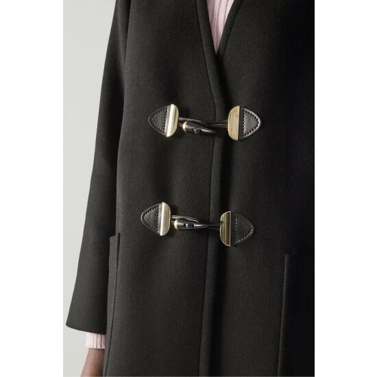 The Cassius coat is crafted in Europe from an Italian black recycled wool blend by Manteco, the leading textile company for sustainability and high-end fabrics. It’s a collarless style with a relaxed fit, toggle fastening detail and patch pockets to the front.