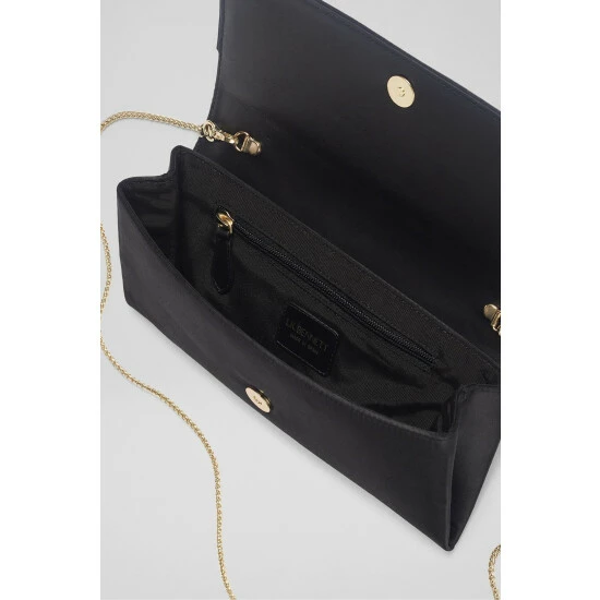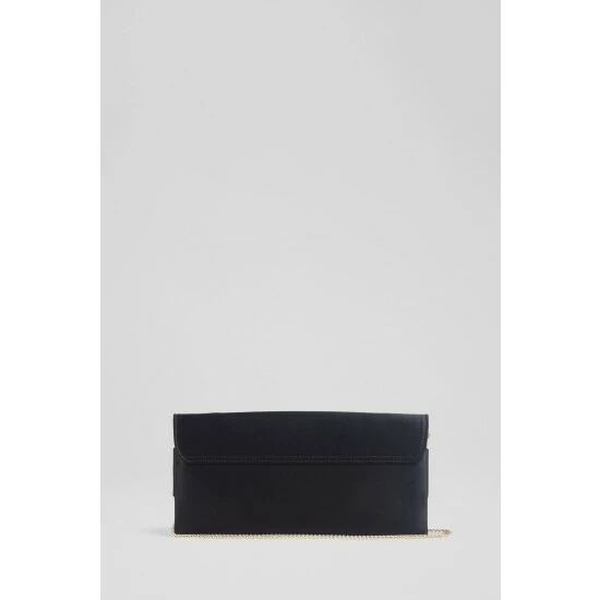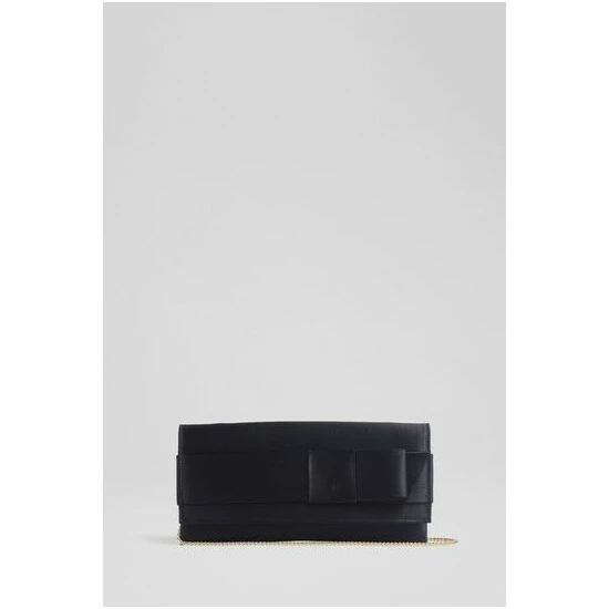 The Catalina clutch bag is crafted in Spain from black satin. It’s a long envelope style with half bow detail to the front, a removable chain shoulder strap and an inside zip pocket.
