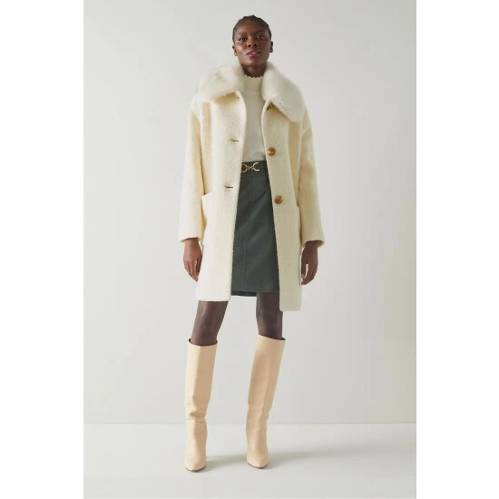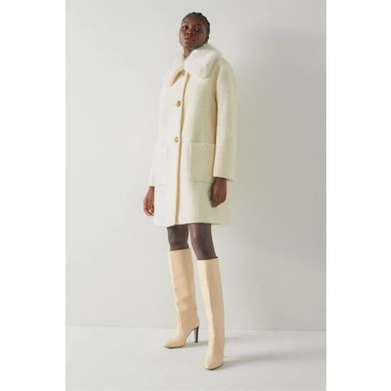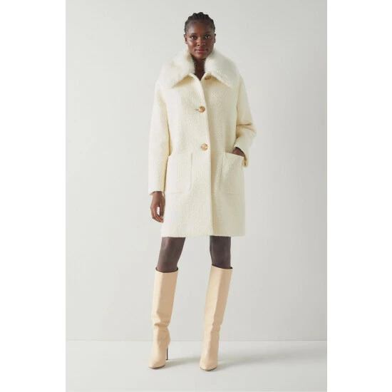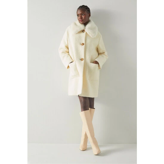 The Aster coat is crafted in Europe from an Italian wool-cotton blend in cream with a bouclé finish. It has a round neck with a removable faux fur collar, a sixties-inspired cocoon shape, large taupe buttons and patch pockets to the front.