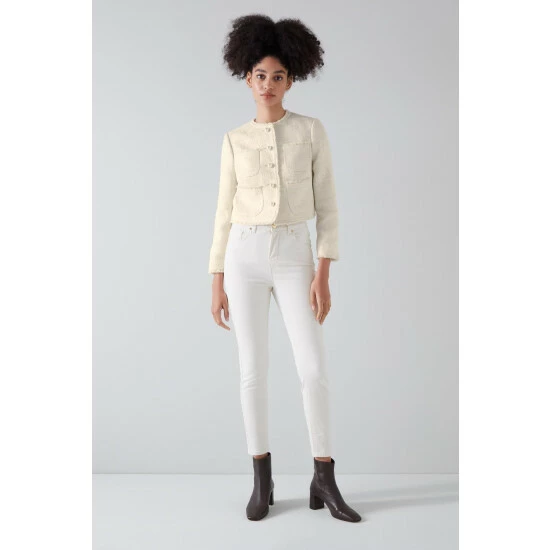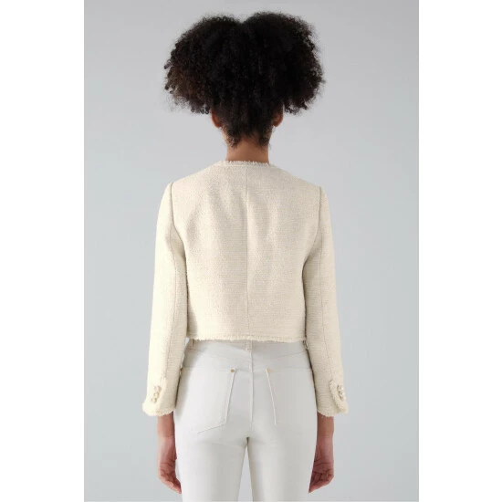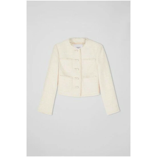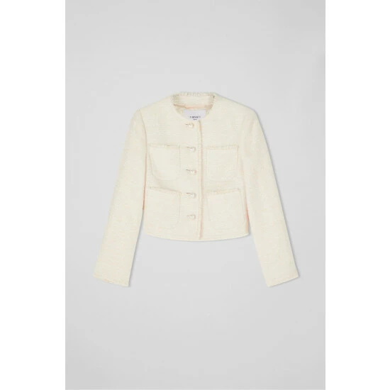 The Celeste tweed cropped jacket is crafted from Italian tweed in cream. It has a round neck, long sleeves, four patch pockets, pearl button detail and a frayed trim.